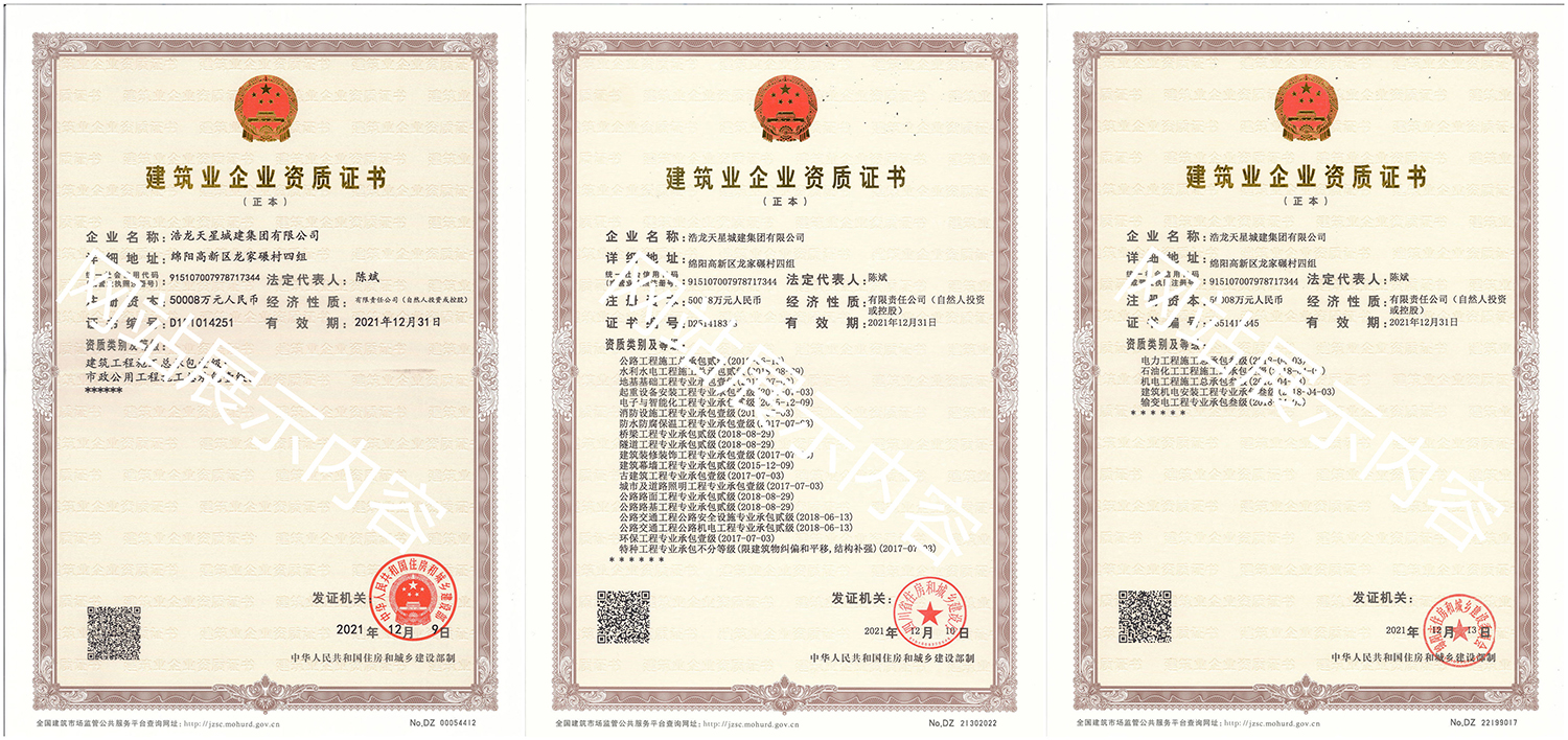 浩龍?zhí)煨浅墙瘓F(tuán)有限公司,2007年成立于“李白故鄉(xiāng)、中國科技城”—四川省綿陽市,企業(yè)注冊資本金5.0008億元。公司共有27項(xiàng)建筑業(yè)企業(yè)資質(zhì),其中國家一級(jí)資質(zhì)11項(xiàng),二級(jí)資質(zhì)10項(xiàng),三級(jí)資質(zhì)5項(xiàng),特種資質(zhì)不分等級(jí)1項(xiàng),類別涵蓋建筑、市政、水利、機(jī)電、隧道、起重設(shè)備安裝等基礎(chǔ)及未來發(fā)展重點(diǎn)專業(yè)。公司...
